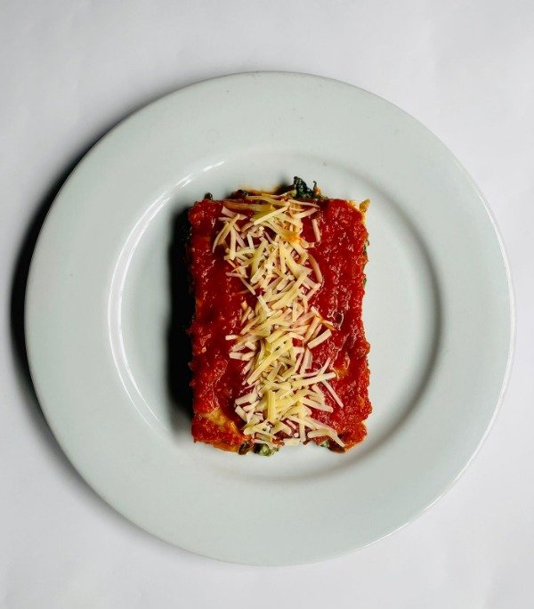 Exquisita lasagna de espinacas salteadas en oliva, panqueques a base de maicena, salsa filetto, salsa blanca y queso parmesano en hebras. Usamos leche deslactosada para estas preparaciones