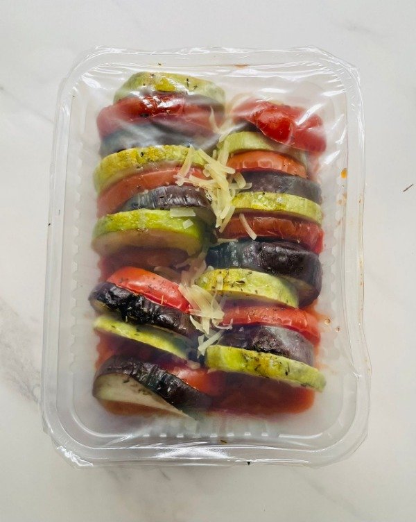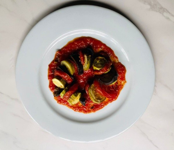 Excelente ratatouille con base de salsa filetto, berenjena, tomate y zucchini cocinado al horno con hierbas aromáticas.Lluvia de hebras de parmesano